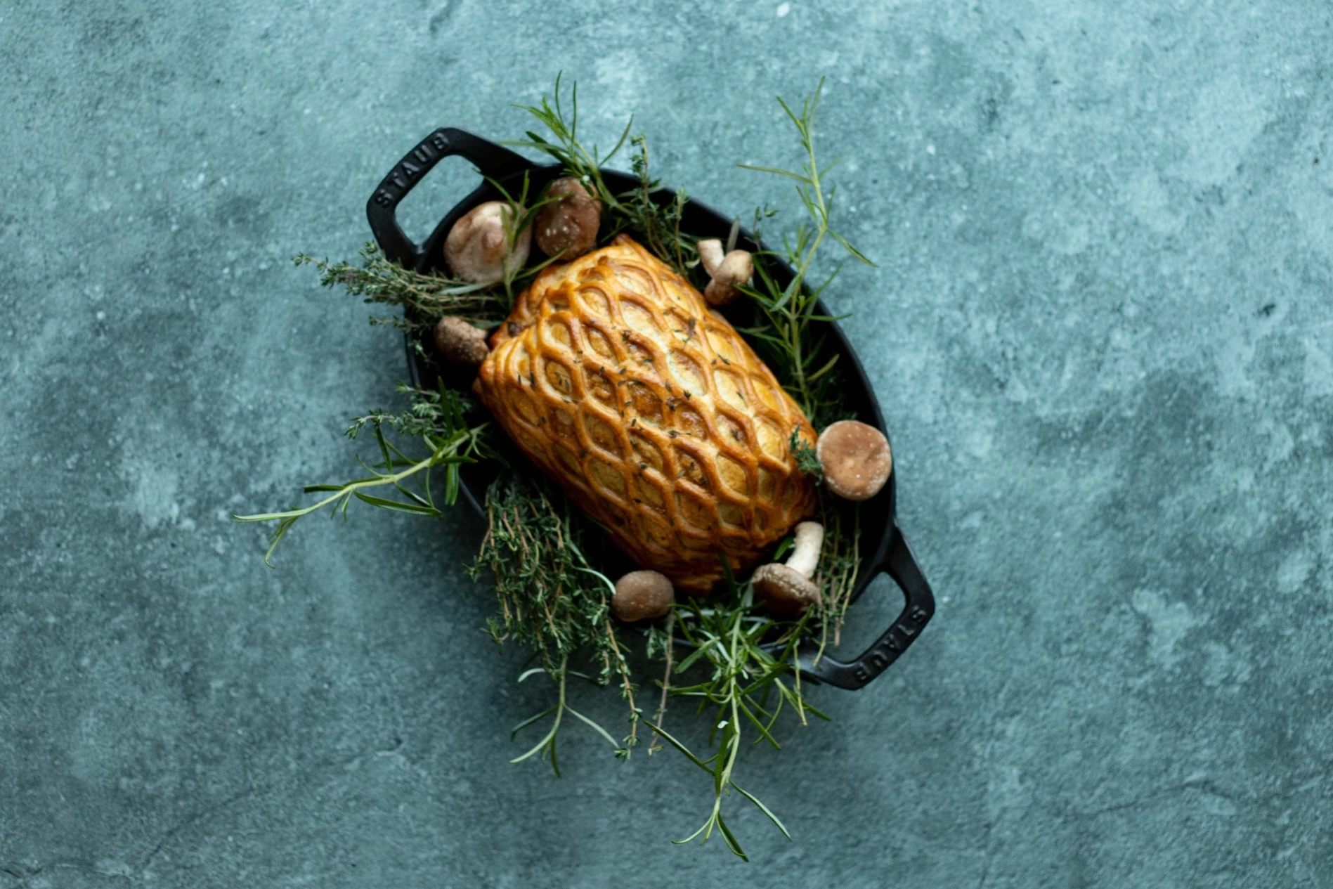 Kempisch wit-blauw runds in bladerdeeg met duxelles van champignons, mosterd en Parmaham. (Lekker met onze fine champagnesaus)
