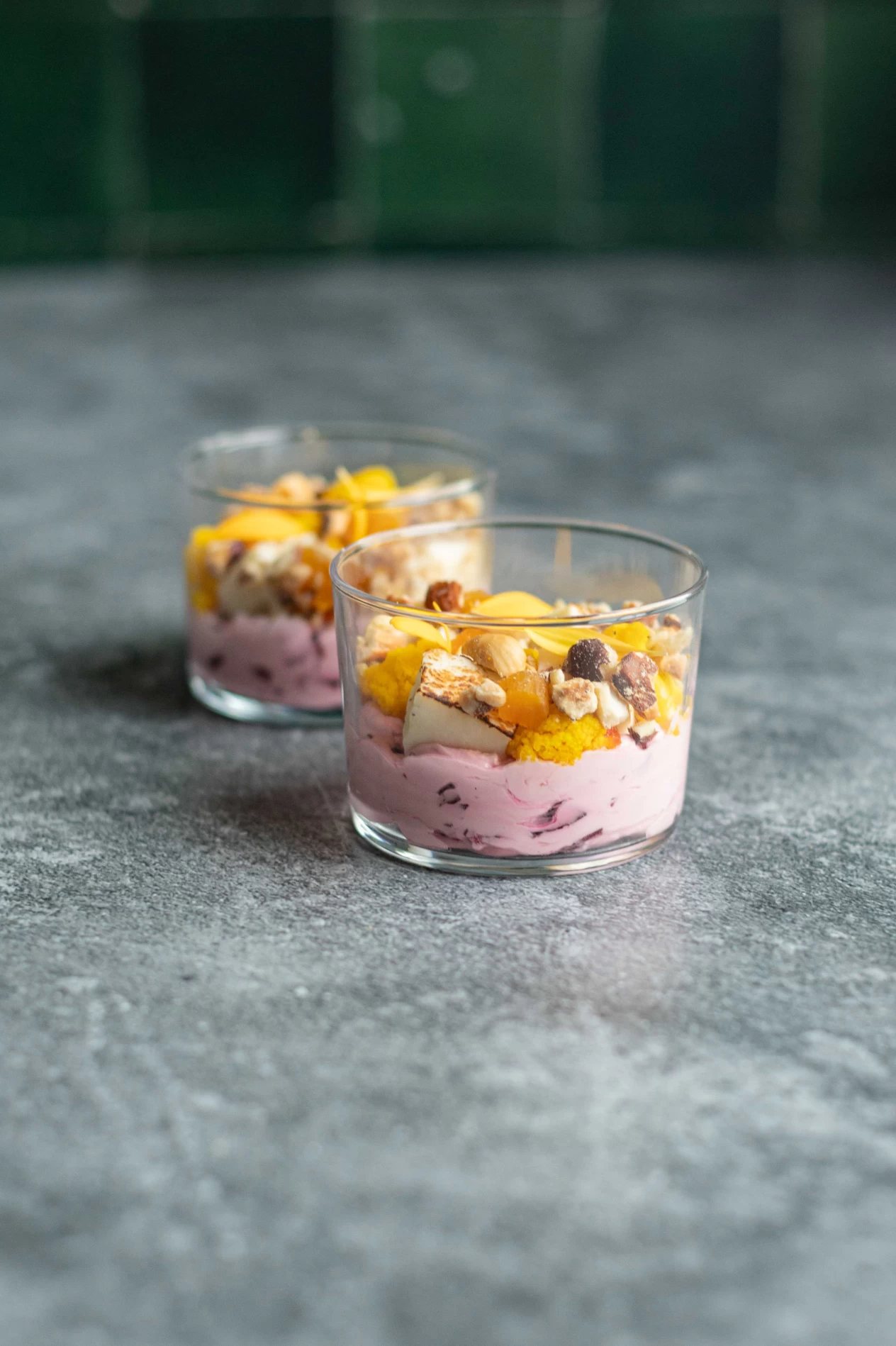 Borrelglaasje gevuld met crème van rode biet, gepekelde bloemkool en gegrilde Halloumi. (Vegetarisch) Deze zijn per 2 verpakt.