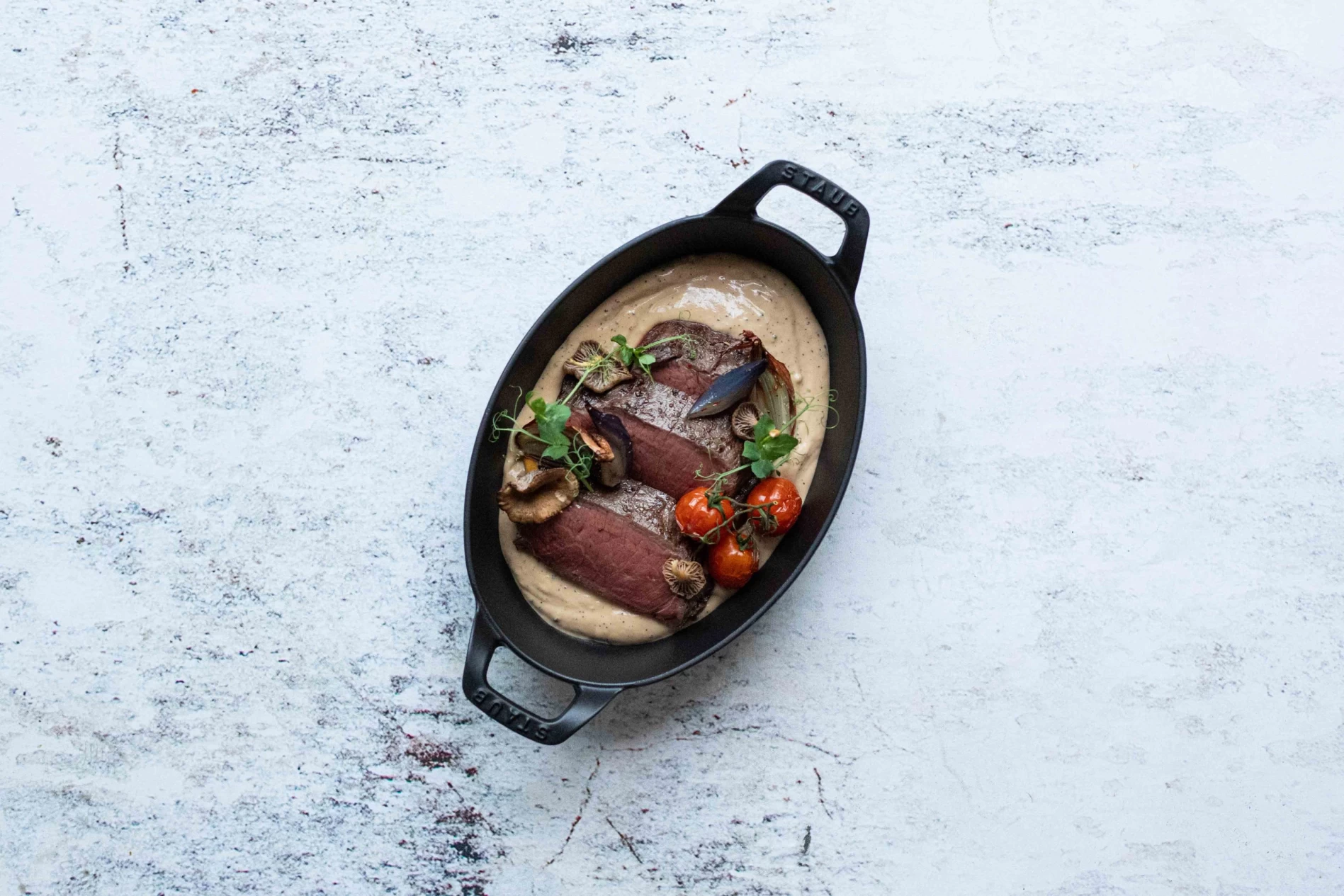 Langzaam gegaarde hertenkalffilet met wildsaus op basis van krieken. (300gr p.p.)