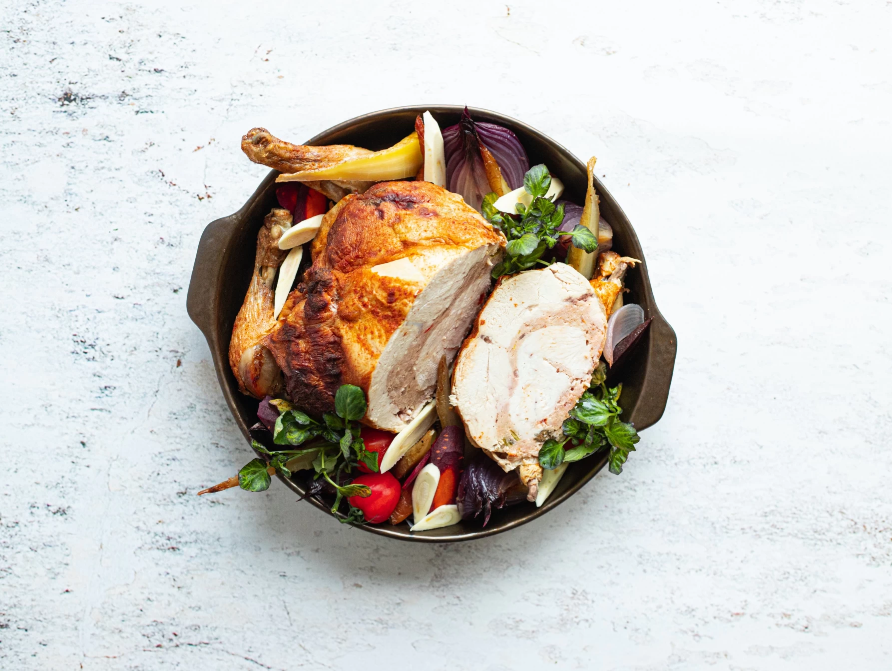 Onze feestkip is gevuld met gevogelte gehakt en seizoensgroentjes.