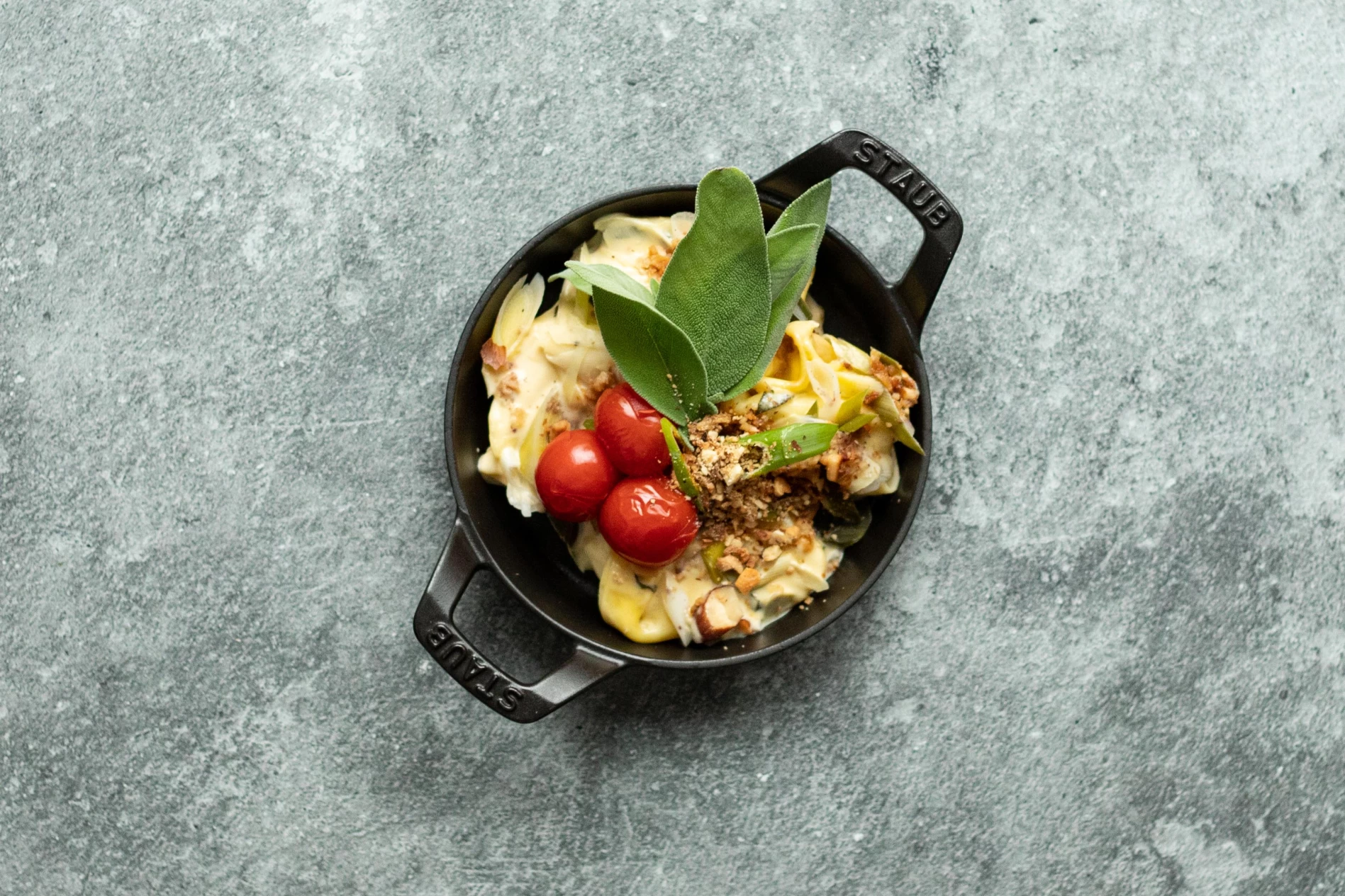 Tortelloni gevuld met kaas en zwarte peper, hollandaisesaus met salie en looktomaatjes.