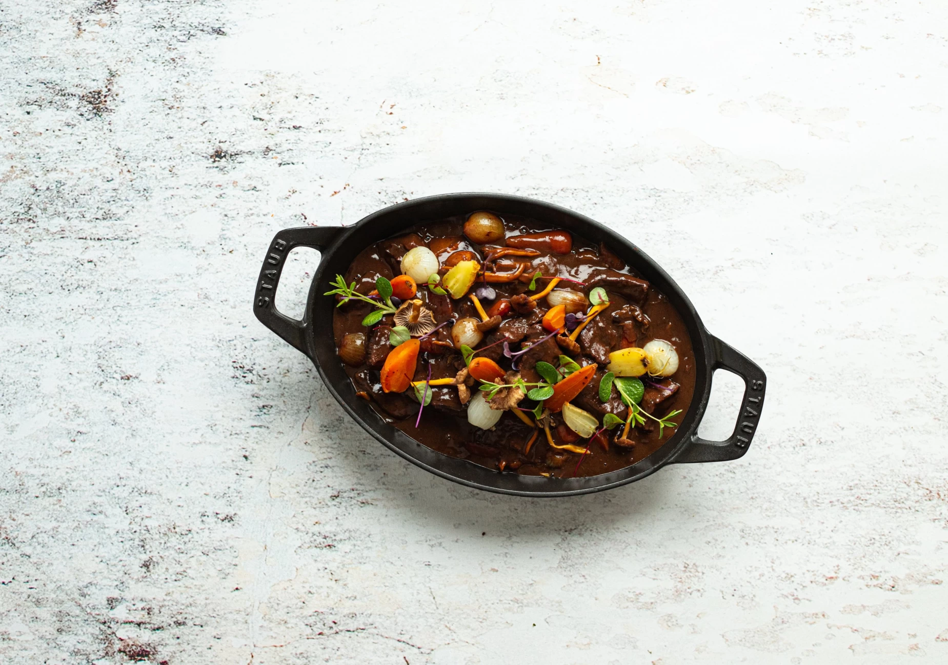 Stoverij van wild hert afgewerkt met gebakken zilveruitjes, boschampignons en winterpeen.